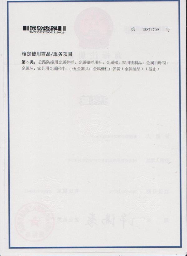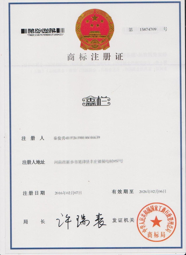 恭喜!新鄉(xiāng)鑫欄護欄廠商標證書成功注冊下來!